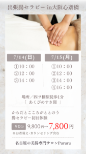 関西圏の皆さまへ 7/14.15 出張腸セラピーin大阪心斎橋のご案内